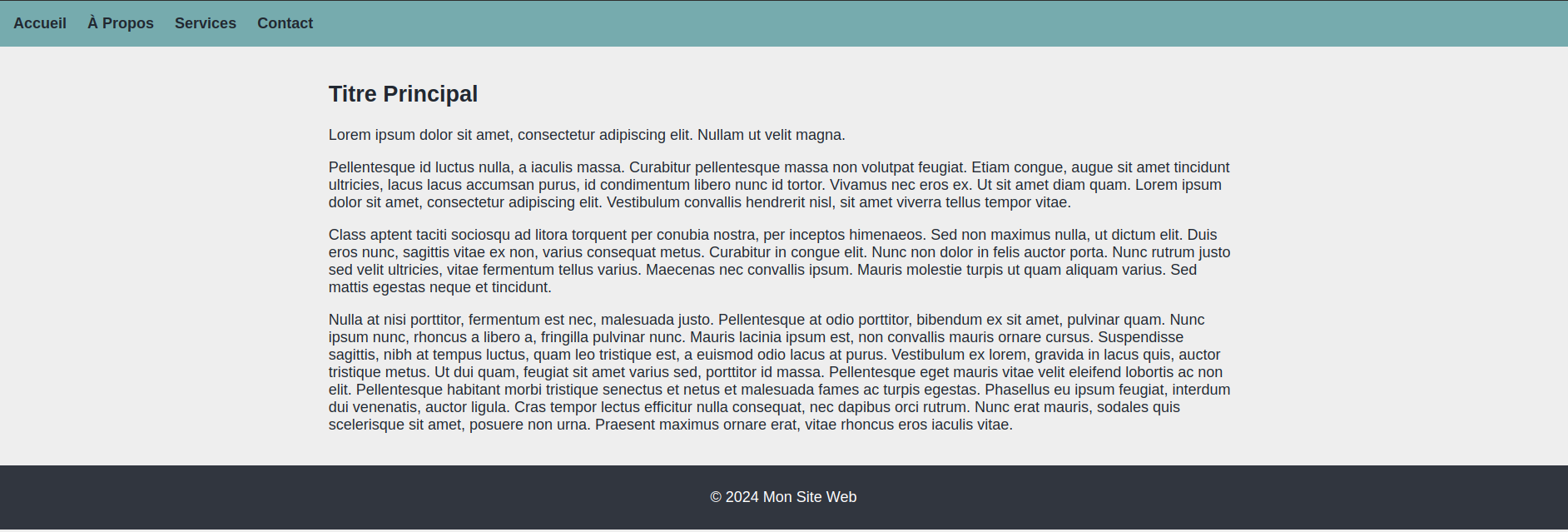 index.htmlet un fichier CSS nomméstyles.css. - Structurer la page HTML avec une navigation, un en-tête, un contenu principal et un pied de page.